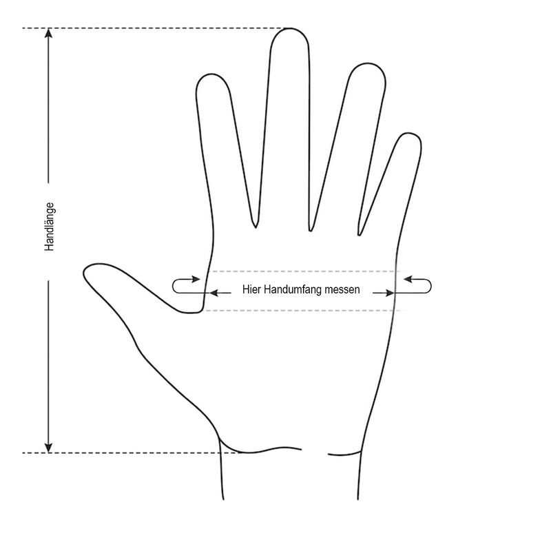 Um die richtige Größe zu wählen, muss mit einem Maßband der Umfang des Handtellers ohne Daumen gemessen werden. |