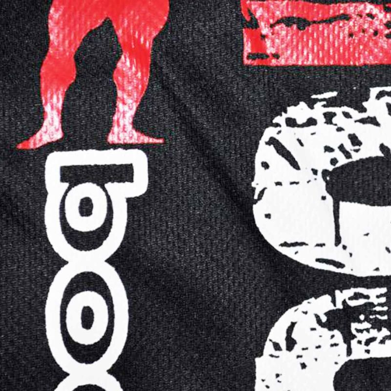 Farben: Schwarz mit weißem und rotem Aufdruck